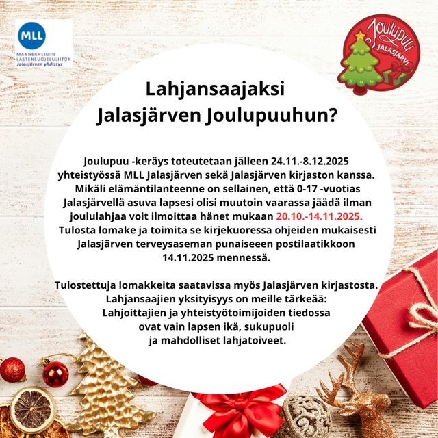 Joulupuu -keräys toteutetaan jälleen marraskuulla pe-la 22.-23.11. yhteistyössä MLL Jalasjärven sekä Perhekeskus Viikerin kanssa. Mikäli elämäntilanteenne on sellainen, että 0-17 -vuotias…